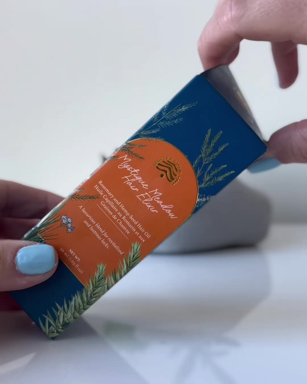 Mystique Meadow Hair Elixir is a blend of 10 nutrient-rich oils, including rosemary, hemp seed, argan, avocado, and more... designed to deeply nourish and hydrate all hair types. This elixir strengthens strands, reduces breakage, and promotes healthy hair growth by improving scalp circulation. Rosemary and hemp seed oils work together to combat thinning, dandruff, irritation, and dryness, leaving your scalp refreshed and balanced. The lightweight, non-greasy formula provides moisture without weighing hair down, while vitamin E protects against environmental damage. Infused with antioxidants, it shields against UV rays and pollution, enhancing shine and restoring balance for hair that feels soft, healthy, and vibrant.